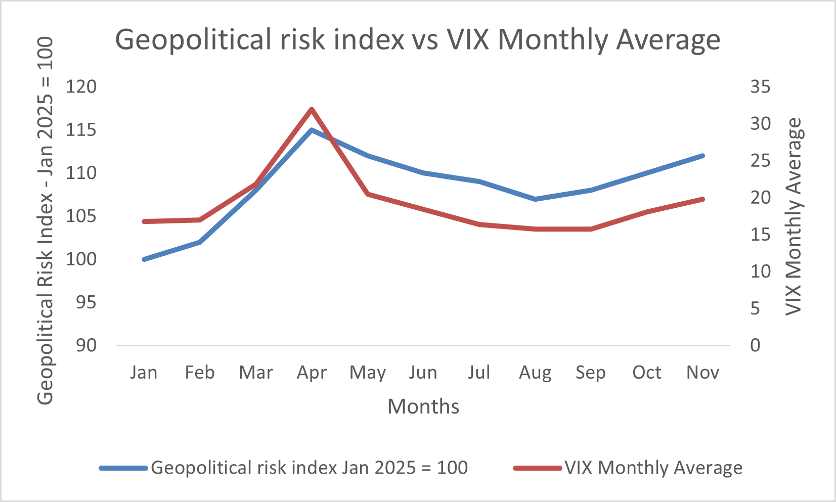 Geopolitical risk remained elevated through 2025 while the VIX stayed below its long run average, suggesting that markets treated geopolitical tensions as a persistent backdrop rather than an immediate systemic shock