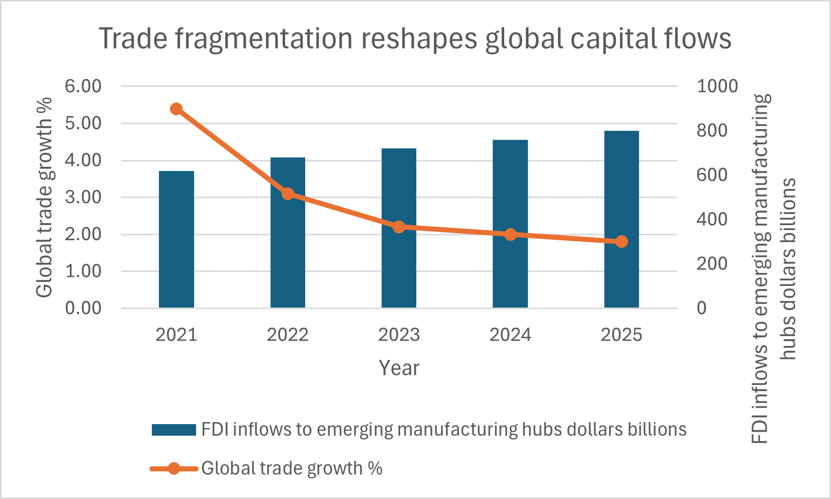 Slowing global trade growth alongside rising foreign direct investment into regional manufacturing hubs highlights how geopolitical fragmentation is reshaping capital allocation rather than reversing globalization outright