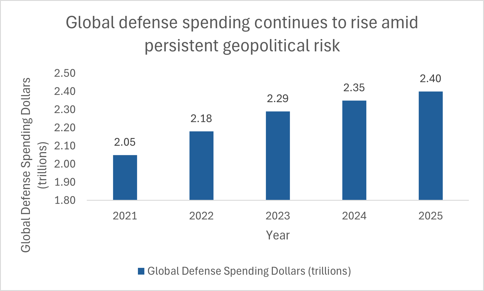 Global defense spending reached approximately 2.4 trillion dollars in 2025, reflecting sustained increases in military and security investment as geopolitical risk becomes embedded in long term fiscal planning