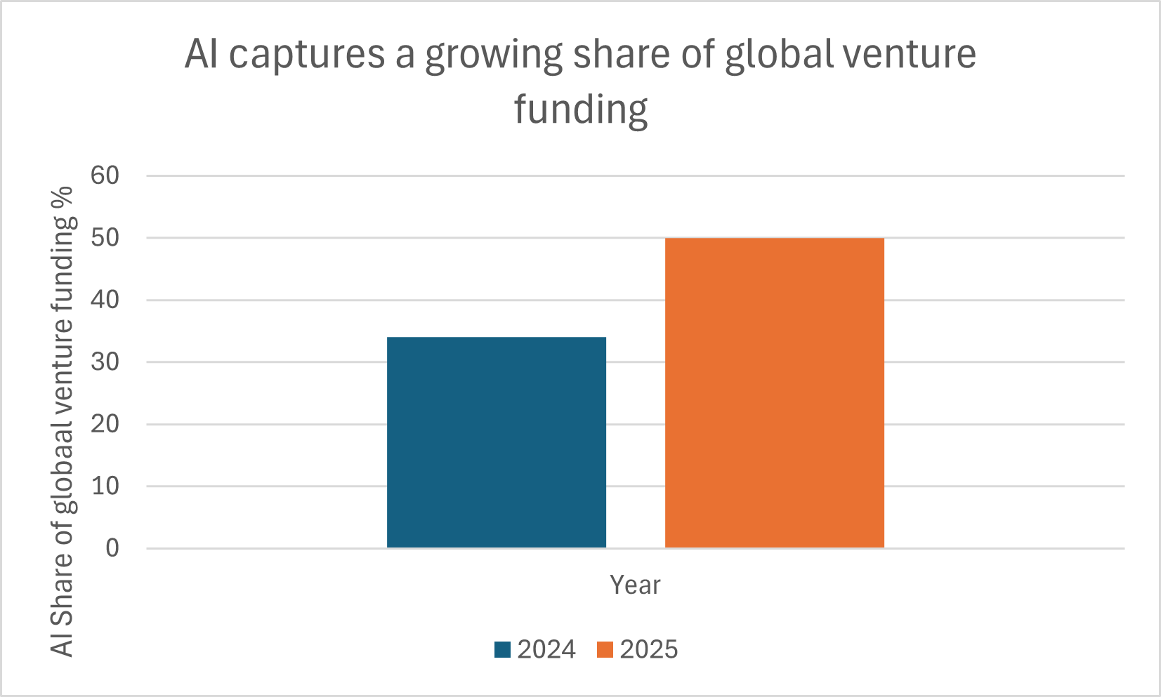 AI accounted for approximately 50% of global venture capital funding in 2025, up from roughly 34% in 2024. This sharp increase shows that investor conviction in AI has continued to strengthen even as overall private market activity remains selective. The data suggests that capital is not broadly returning to risk, but instead concentrating in sectors with clear revenue potential, scalability, and strategic importance. For markets, this reinforces the idea that AI is no longer a niche growth theme but a core driver of capital allocation across technology and private markets heading into 2026