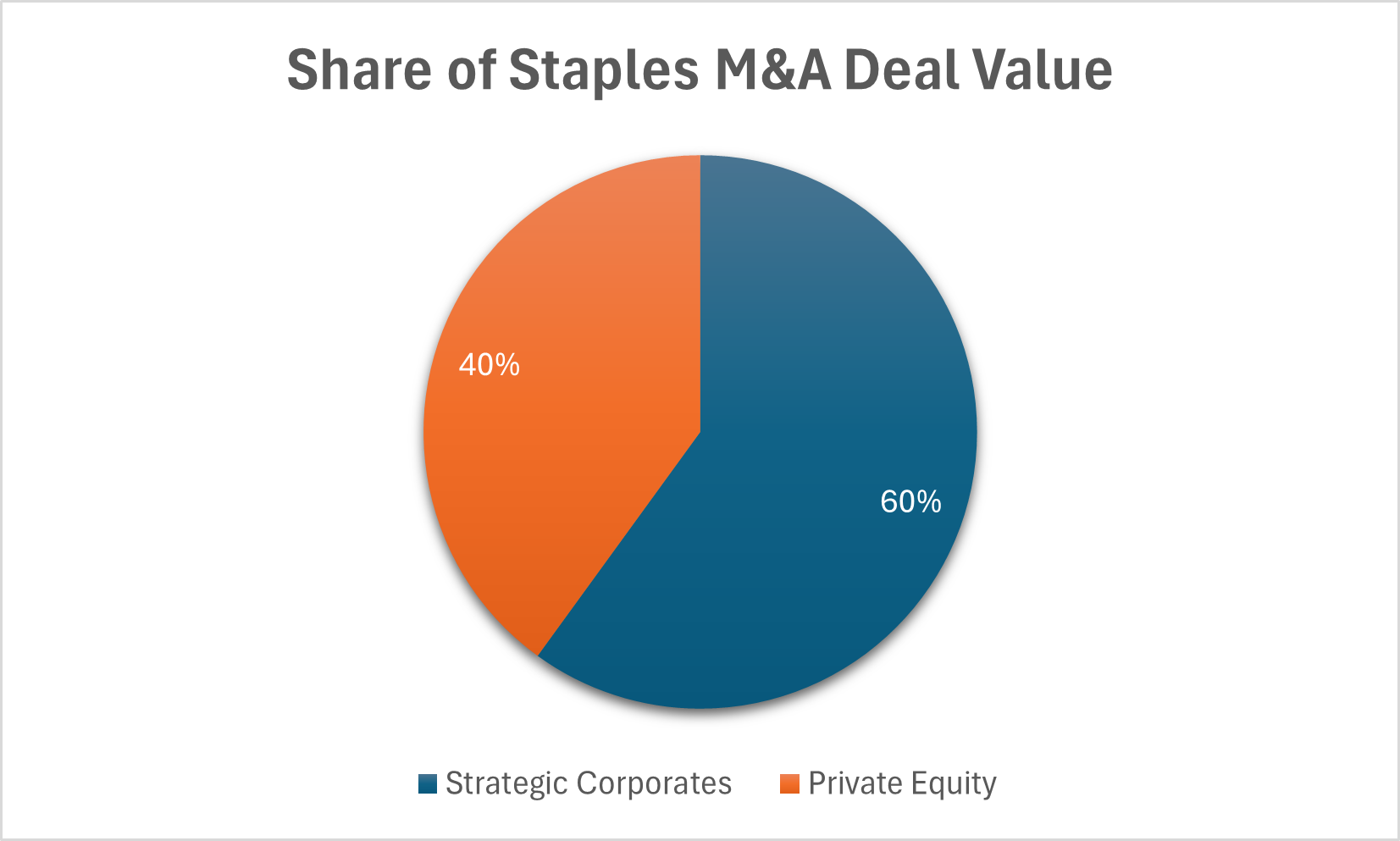 Buyer composition of consumer staples M&A deal value shows elevated participation from private equity, consistent with transactions centered on margin improvement, portfolio rationalization, and operational restructuring